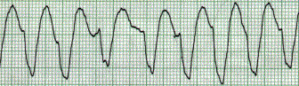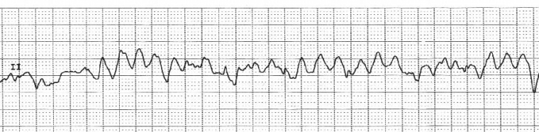 심실의 여러 세포가 이소성 pacemaker로 작용하여 심실이 매우 빠르게 꿈틀거리는 것으로 QRS군이 없다.