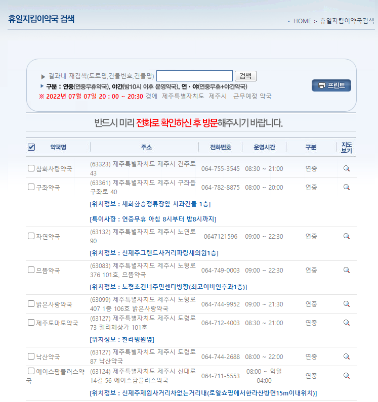 4. 아래처럼 검색조건에 맞는 약국목록을 확인할 수 있습니다.