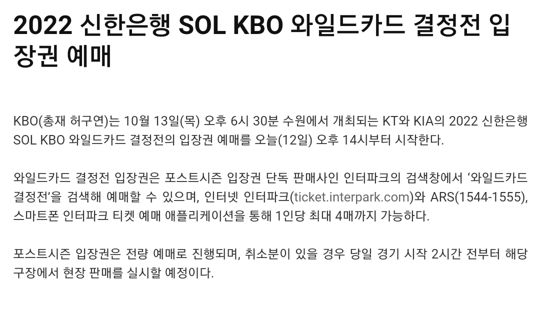 2022 야구 와일드카드 예매가 시작되었습니다. 포스트시즌은 10월 13일부터 수원구장에서 시작될 예정입니다.