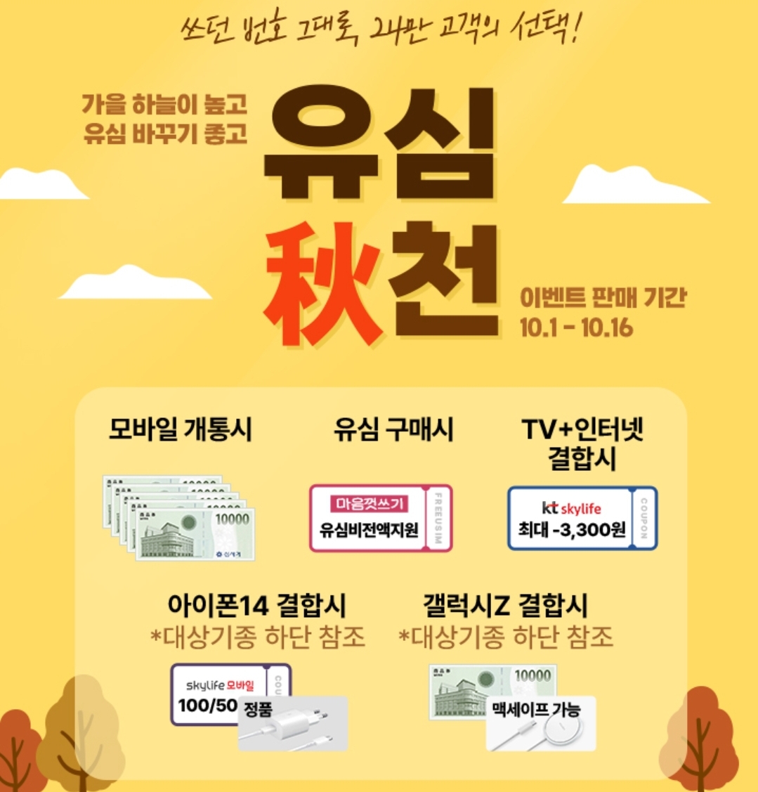 KT 스카이라이프 알뜰폰이 10월 가입자 유치 이벤트를 진행하고 있습니다. 홈페이지만 봐서는 잘 이해가 안가는데, 알기 쉽게 정리해볼게요.