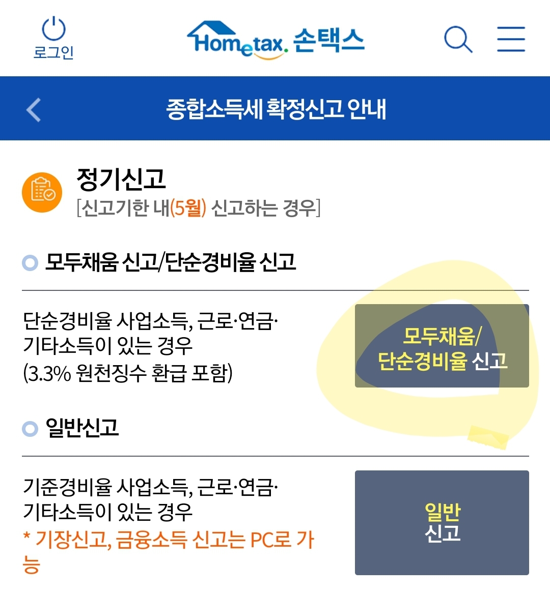 2. 모두채움/단순경비율 신고를 눌러줍니다.