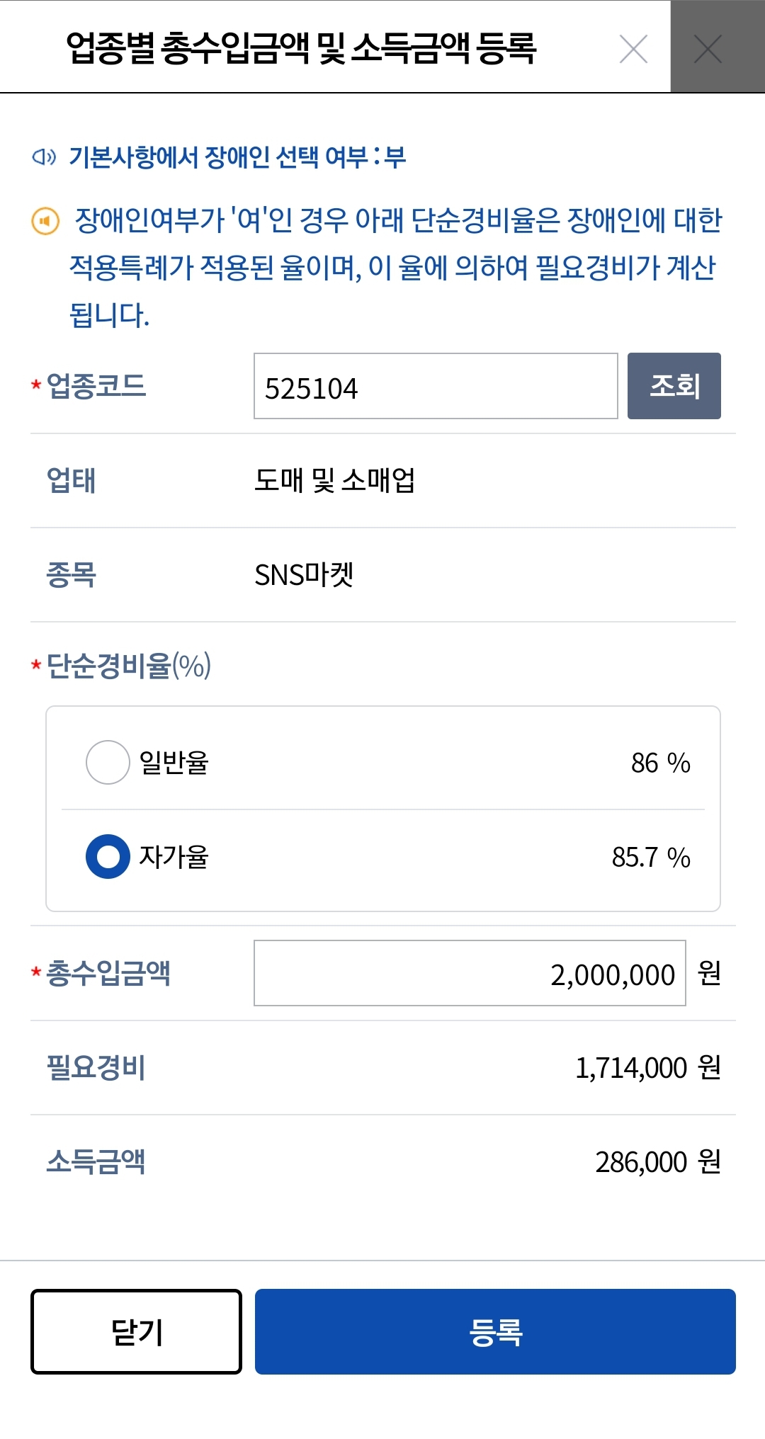 블로거 업종코드 알아보면, 525140, SNS 마케팅입니다. 단순경비율이 꽤나 높은 업종이에요. 단순경비율이 85.7%입니다. 1000만원을 벌어도 857만원은 비용으로 인정해줘서 143만원만 소득이 인정된다는 뜻입니다.