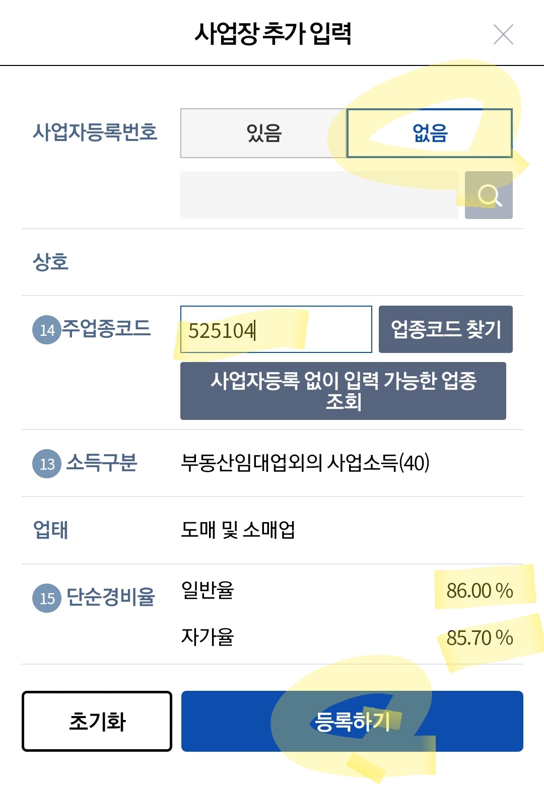 5. 사업소득을 체크해주고 업종코드를 입력합니다.