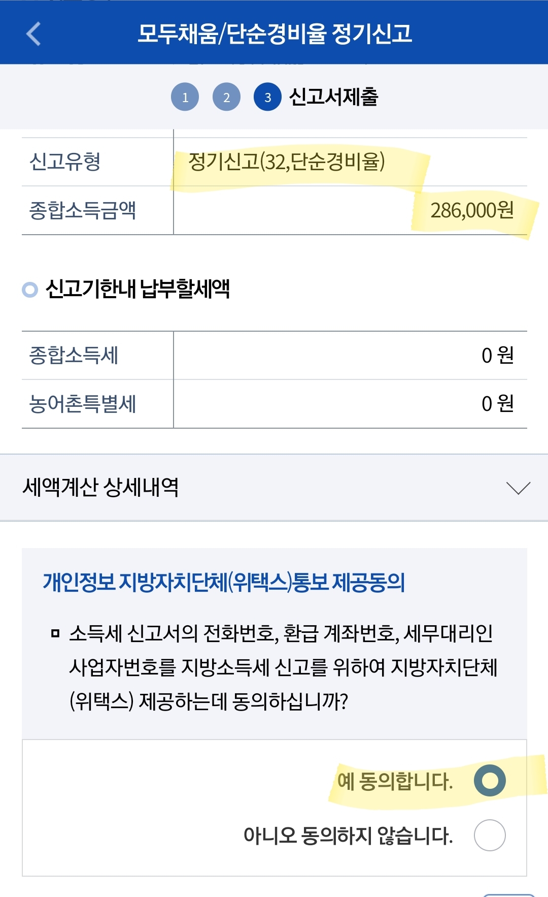 저는 200만원을 입력하고 단순경비율을 적용해서 소득금액이 28만원, 소득공제금액이 150만원이어서 내야할 세금이 없습니다. 근로소득이 있으신 분들은 286000원에 대한 세금을 다 내셔야 할거에요.