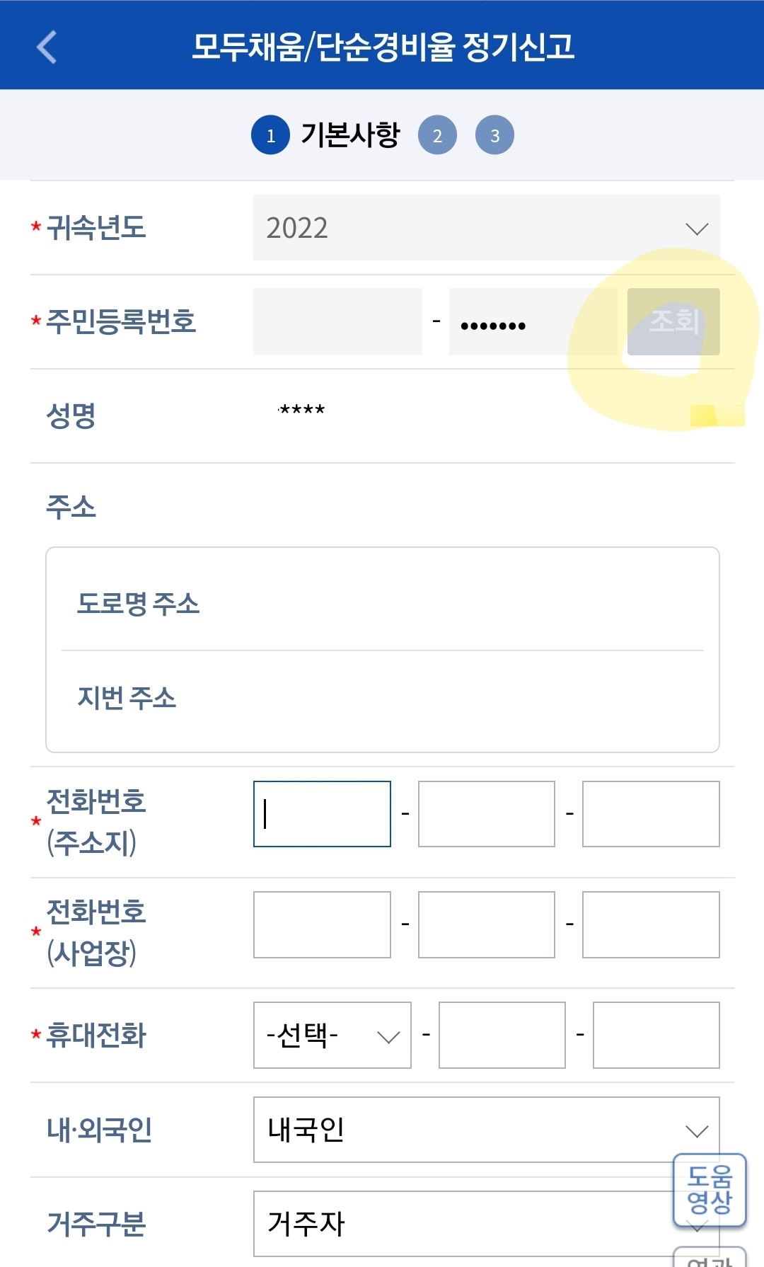 4. 주민등록번호 오른쪽에 '조회'를 눌러주시고 인적사항을 입력해줍니다.