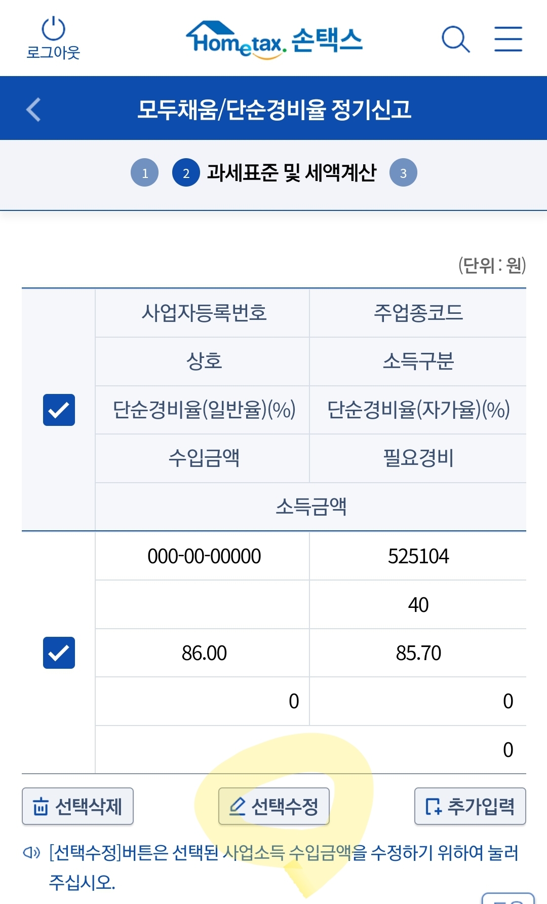 6. 이제 업종코드가 입력이 되었으면 소득을 입력해줍니다. 애드센스나 네이버에서 받은 금액을 입력해주시면 됩니다. '선택수정'을 눌러주시면 소득금액을 입력할 수 있습니다.